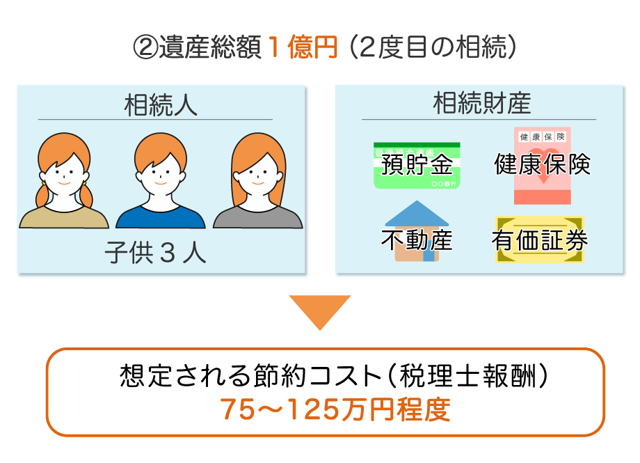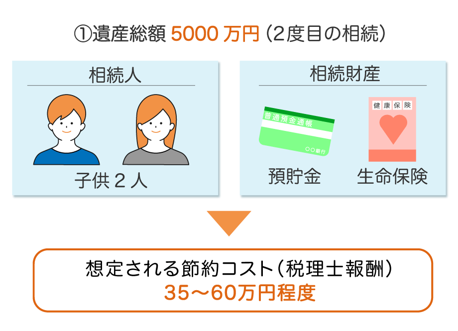 父親の相続で財産を引き継いだ母親が亡くなり、子ども2人が相続人になったケースです。財産は2種類のみと極めてシンプルですが、税理士に依頼すると35~60万円程度の報酬がかかります。