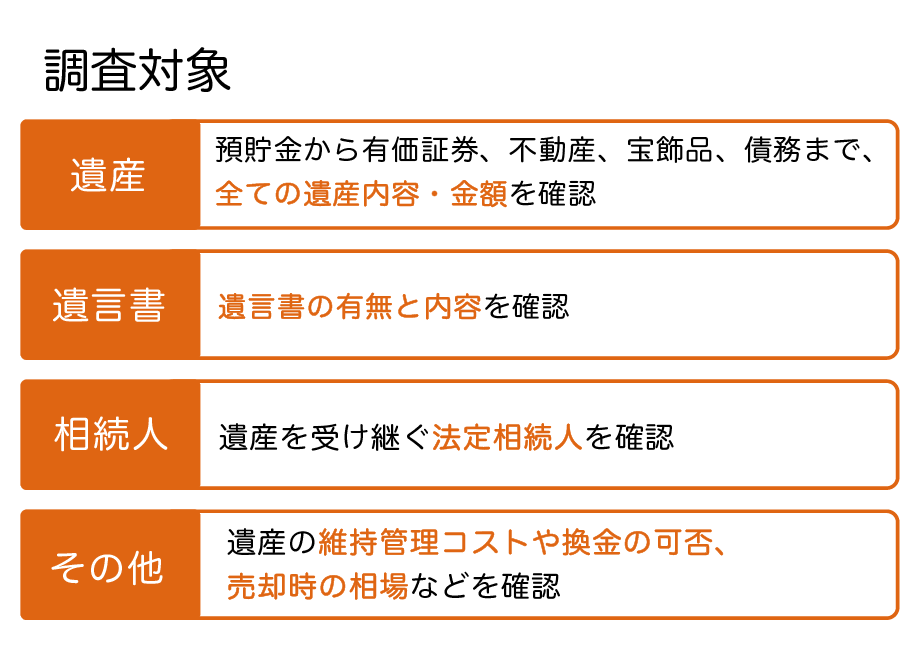 それぞれ期限が短いため、相続発生後は速やかに下記の調査を開始してください。