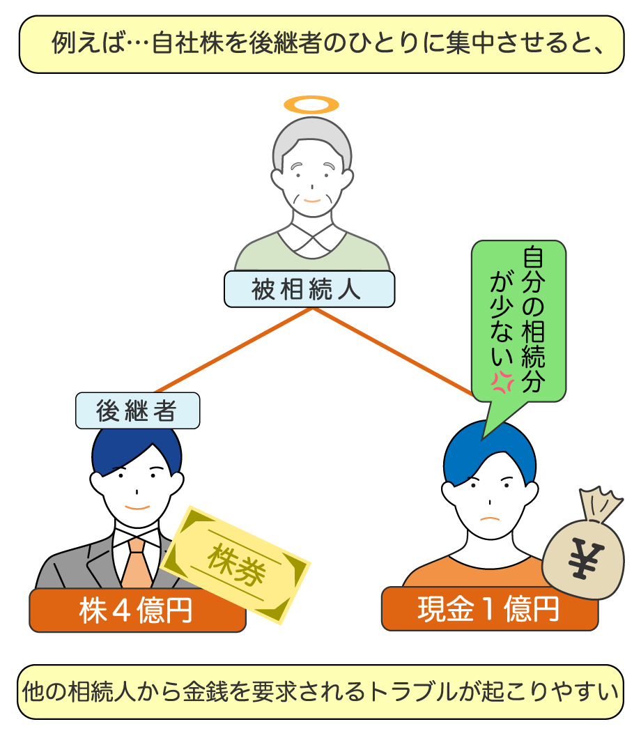 しかし、この自社株承継は相続時に思わぬ金銭トラブルを引き起こします。具体的には、他の相続人から後継者に対して「自分たちの取り分が少なすぎる」と主張され、金銭を要求される可能性があります。