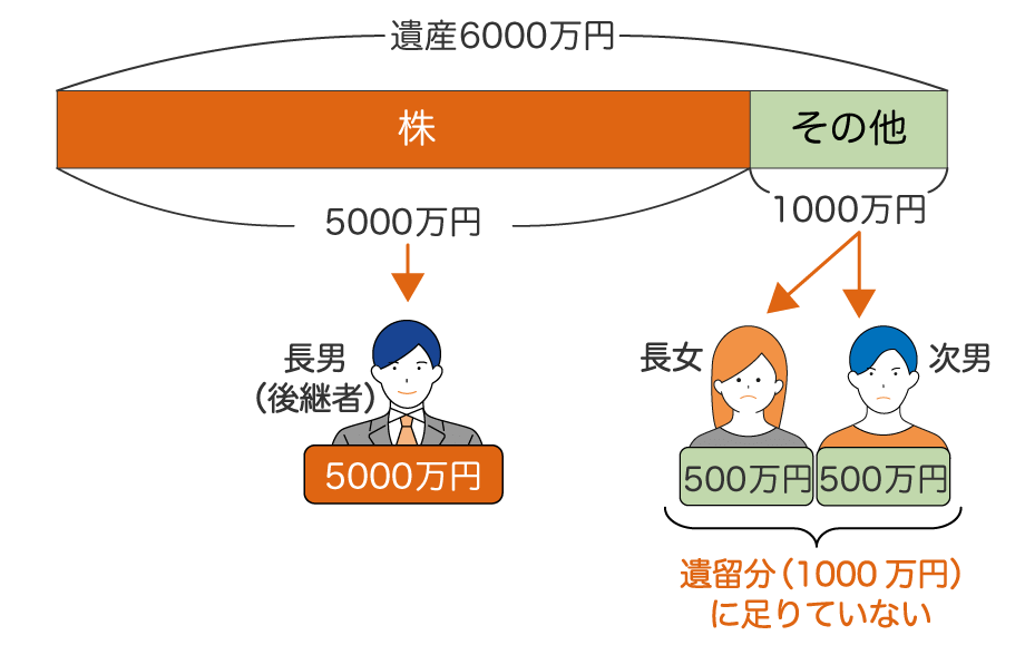 ところが、実際に相続が発生した際、遺産6,000万円のうち5,000万円は自社株でした。事業を引き継ぐ長男が自社株をすべて受け取ると、次男と長女がそれぞれ受け取れる遺産は1,000万円もありません。
