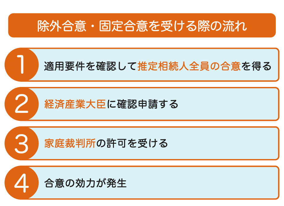 遺留分に関する民法の特例に基づき除外合意や固定合意を行う際の流れは下記のとおりです。