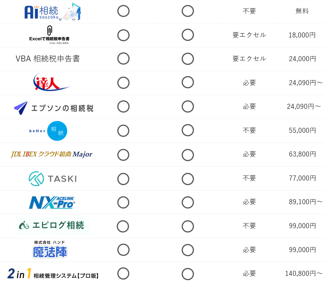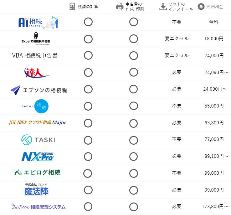 今回は、一般の方が無料で使えるものから専門家向けのものまで、相続税申告書を作成できるクラウドソフトやプログラム、エクセルを紹介していきます。主要なソフトの機能や利用料金は以下の通りです。